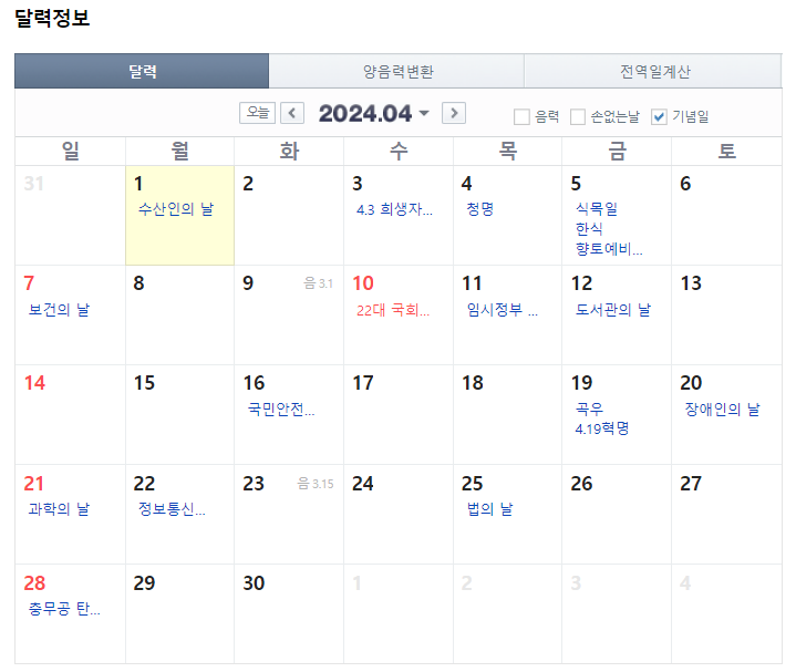 4월은 제22대 국회의원 선거가 있어 4월 10일(수)이 휴일입니다.