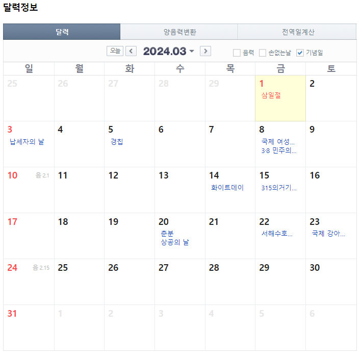 3월은 3월 1일이 삼일절로 휴일입니다.