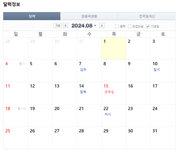 8월은 8월 15일(목)이 광복절로 휴무입니다.